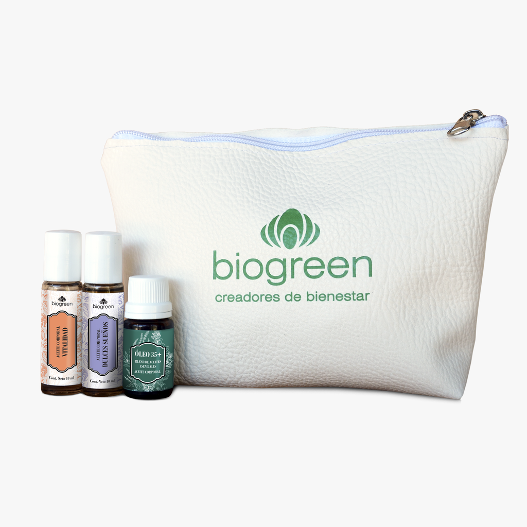 Neceser Biogreen + Aceite Corporal 10 ml Dulces Sueños y Vitalidad + Óleo 35 10 ml + folleto.